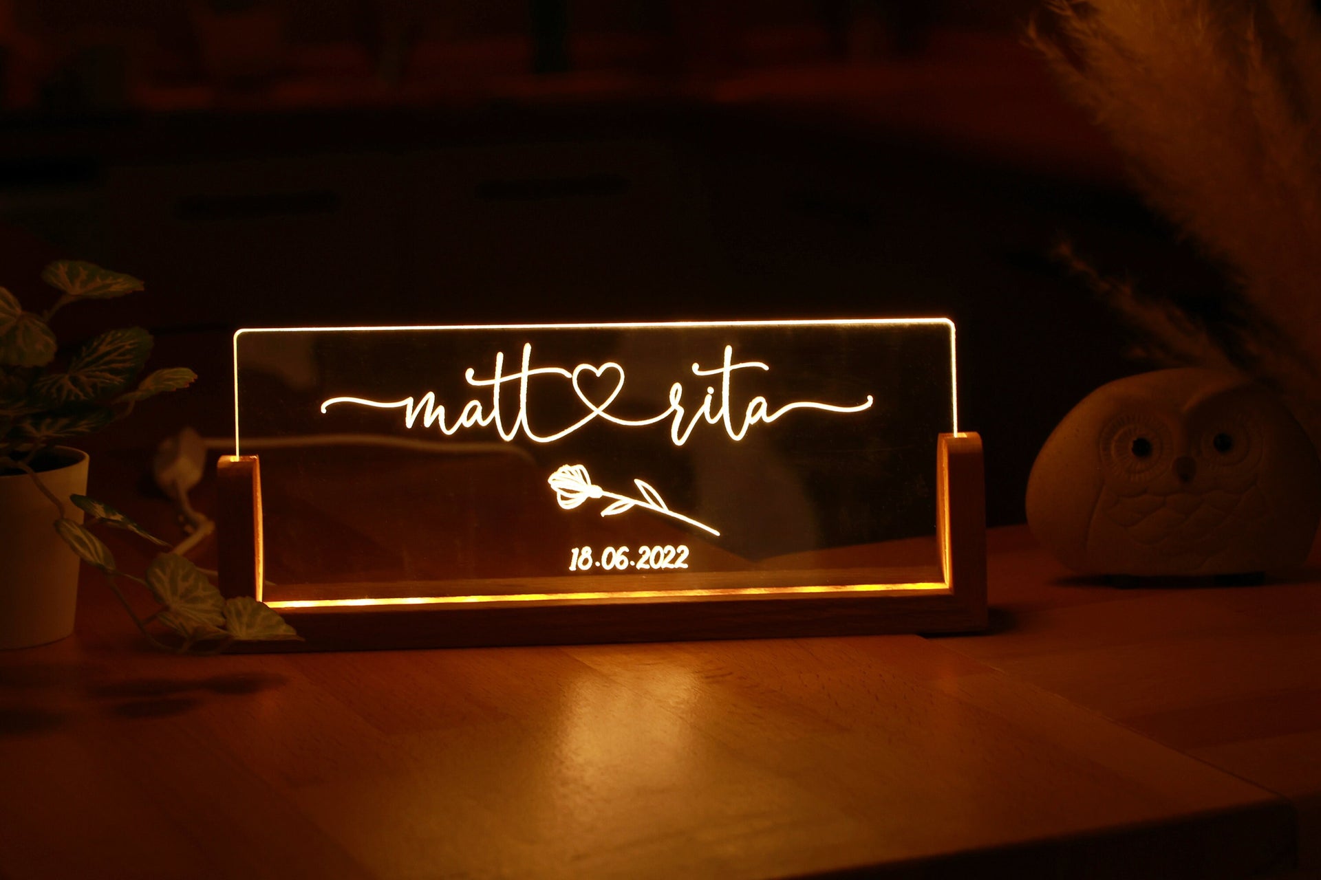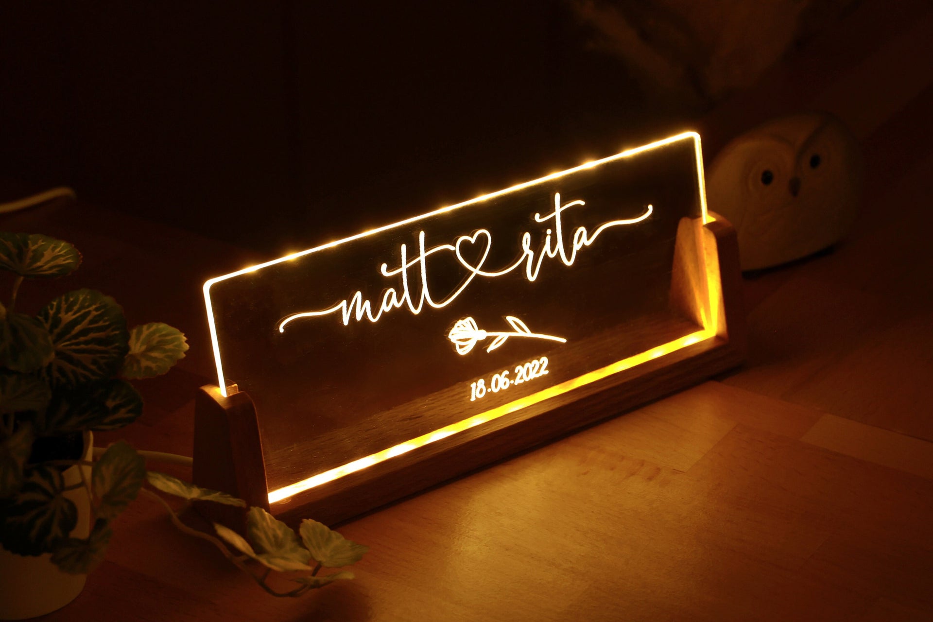 Illuminate your love story with our personalized plexiglass night light for couples. Whether you're an unmarried couple, newlyweds, or a long-married pair, this night light is designed to celebrate your unique bond. It's the ideal gift idea for any anniversary, including your first, and it beautifully represents your journey as a couple.