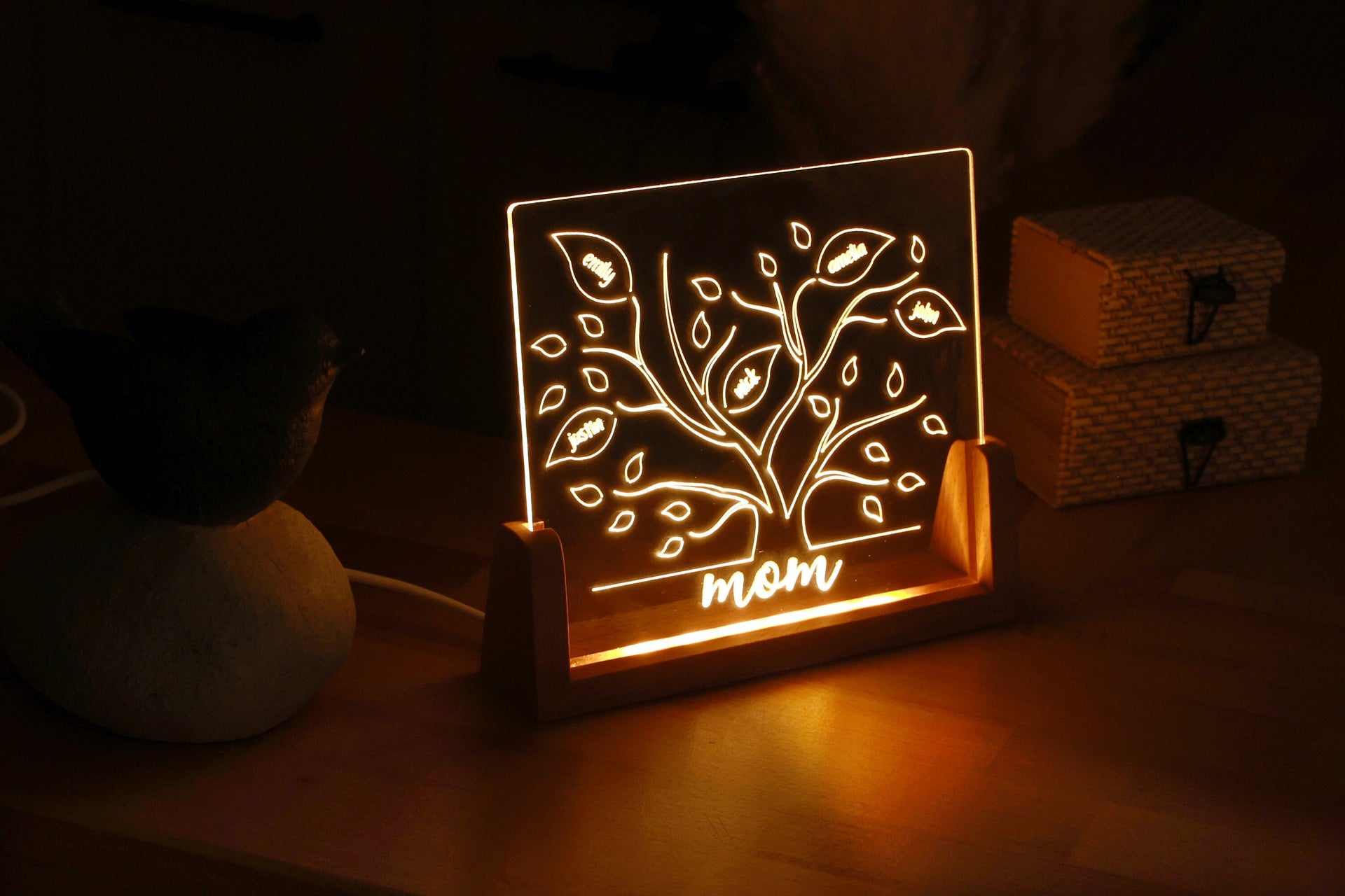Verleihen Sie Ihrem Zimmer mit diesem wunderschönen, individuellen Nachtlicht aus Plexiglas und Holz Farbe.